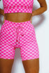 This pink checkered ribbed fabric is a blend of 74% nylon and 26% spandex, now with more sturdy grommets on the front and a drawstring that is sewn in on the back so you cannot lose it!!!
