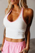 With a heavy weight but stretchy athletic fabric, this top is super comfortable! Featuring a halter like piece that goes around the neck with two thin straps down the center of the back that sets it apart from other design!
